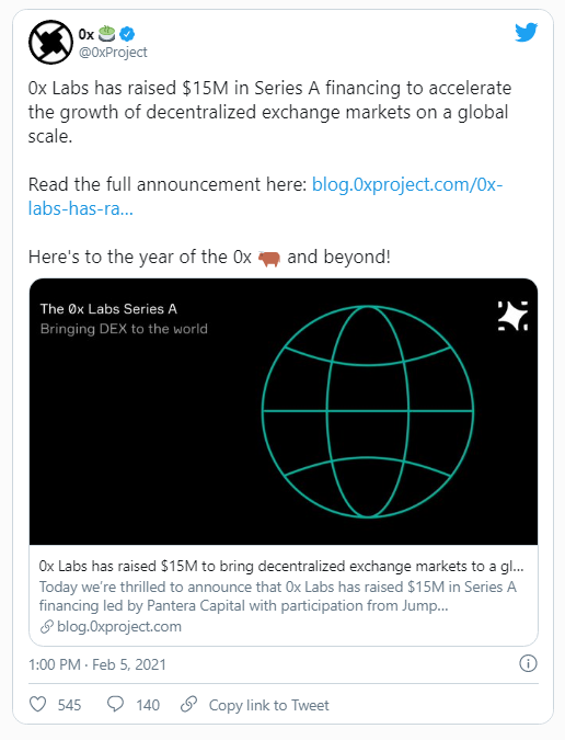 0x Protocol (ZRX) parece haber vuelto de entre los muertos tras el último anuncio del proyecto. 0x Labs anunció en un tweet reciente que la compañía había asegurado una ronda de financiación Serie A de 15 millones de dólares.