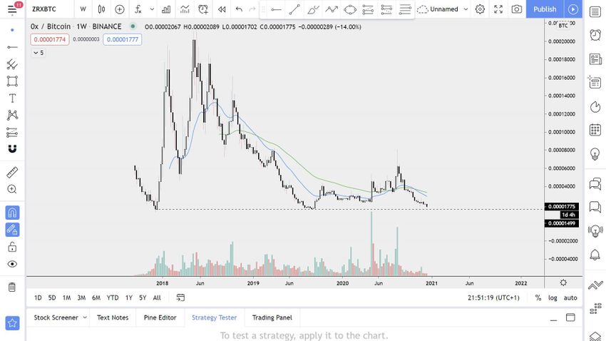El par ZRX/BTC está operando muy cerca de sus mínimos históricos, pero aún no ha dado señales de reversión alcista.