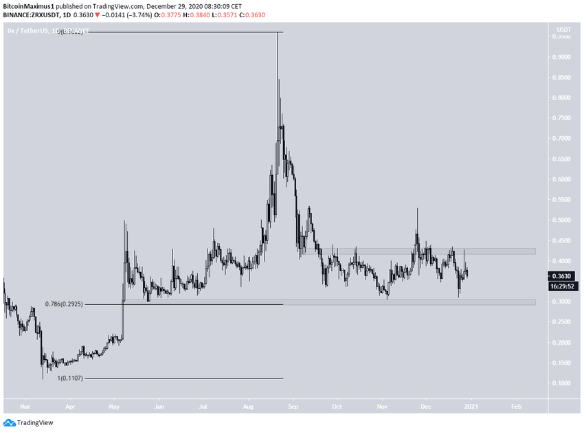 ZRX ha estado bajando desde que alcanzó un máximo de 0,96 dólares el 21 de agosto. La disminución ha sido rápida y ZRX alcanzó el área de soporte de 0,295 dólares a principios de noviembre.