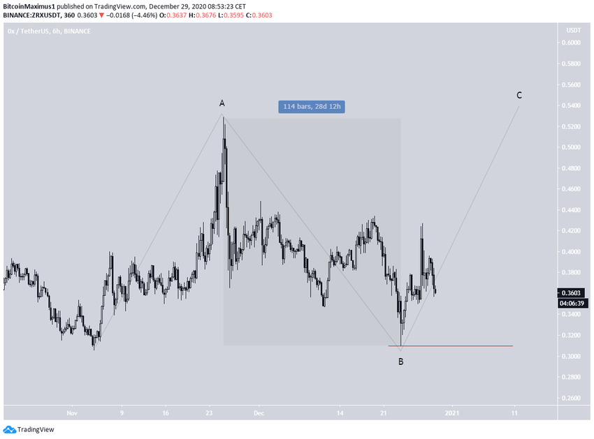 El recuento de ondas sugiere que el ZRX está en la onda C de una estructura correctiva A-B-C (que se muestra en negro en la imagen de abajo). La parte más fácilmente identificable de esta estructura es la onda B, que parece totalmente correctiva.