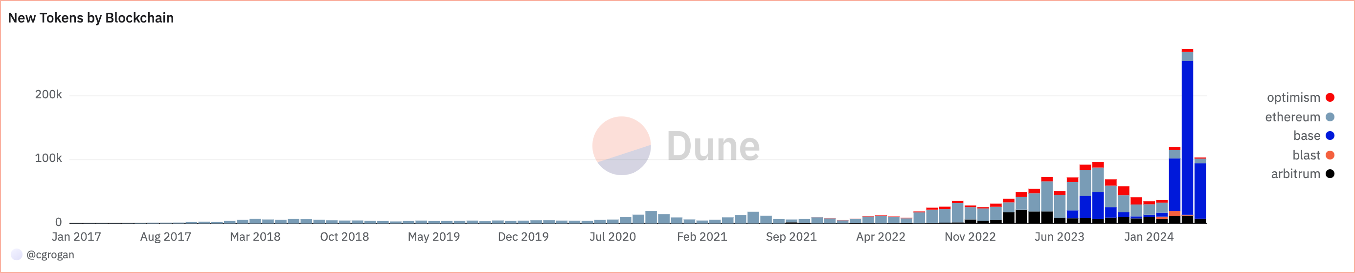 En particular, la mayoría de los nuevos tokens de la blockchain Ethereum, que ascendieron a 327.553, debutaron en la red de Capa 2 de Coinbase, Base. Esta plataforma ha atraído a muchos desarrolladores, especialmente los centrados en memecoins, debido a sus reducidos costes operativos.