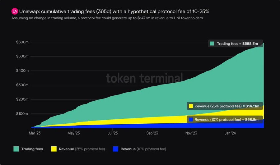 El análisis revela que, si se hubiera activado el cambio de tarifa, los holders de UNI podrían haber acumulado hasta 58 millones de dólares de los 588,3 millones de dólares en tarifas de trading generadas al facilitar 437,7 mil millones de dólares en volumen de trading durante el año pasado. Token Terminal señaló: