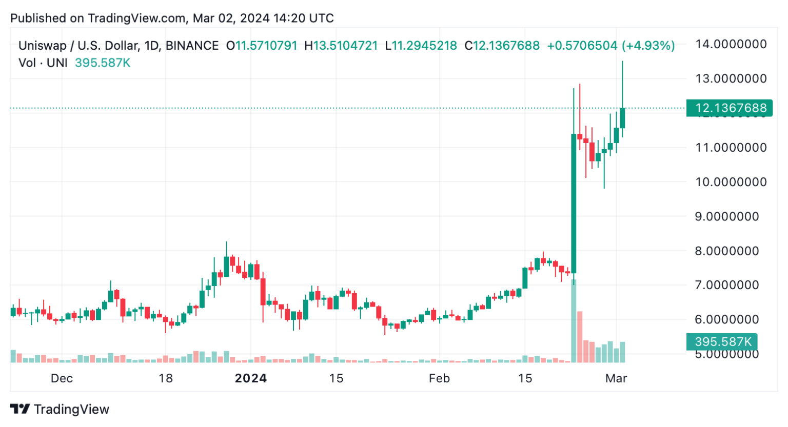 El precio de UNI ha subido en las últimas semanas, ganando un impulso sustancial tras la introducción de la nueva propuesta de gobernanza. Los datos de precios de BeInCrypto muestran que el valor de mercado de Uniswap se ha disparado 100% en el último mes.