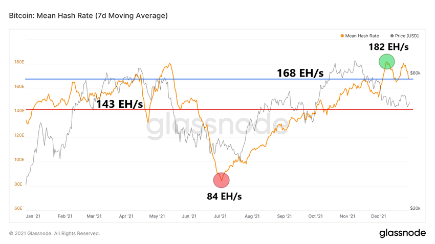 A pesar de los dramáticos eventos que rodearon el cierre de la minería en China, la red recuperó rápidamente su capacidad minera. Recientemente, en diciembre, el hashrate alcanzó un nuevo máximo histórico en 182 EH/s (círculo verde) y cierra el año en 168 EH/s.