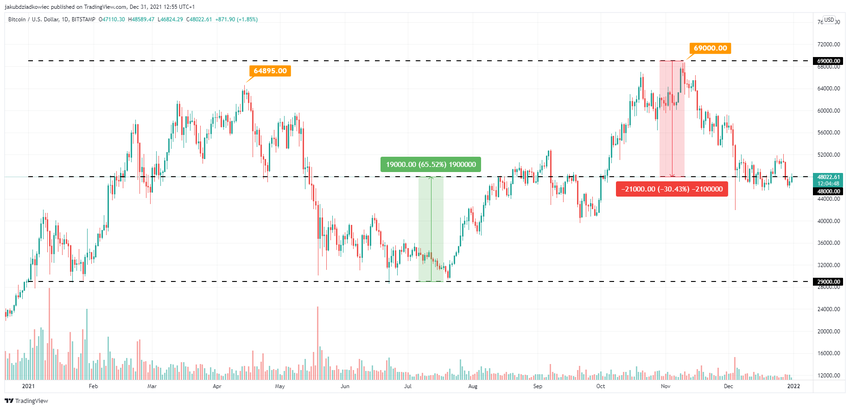 En general, Bitcoin estuvo en una gran consolidación en el rango de 29,000 dólares – 69,000 dólares a lo largo de 2021. Esto se asemeja a un canal paralelo con una mediana de 49,000 dólares. Al mismo tiempo, el mercado experimentó una alta volatilidad a medida que la negociación pasó de la resistencia del canal, a través de la mediana, al soporte y viceversa.