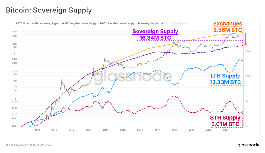 Un informe reciente de Glassnode presenta un gráfico que compara el suministro de Bitcoin en manos de los holders a largo y corto plazo (LTH y STH), la cantidad de BTC en los exchanges y el llamado suministro soberano. Este último se define como todas las monedas fuera de las reservas de los exchanges.