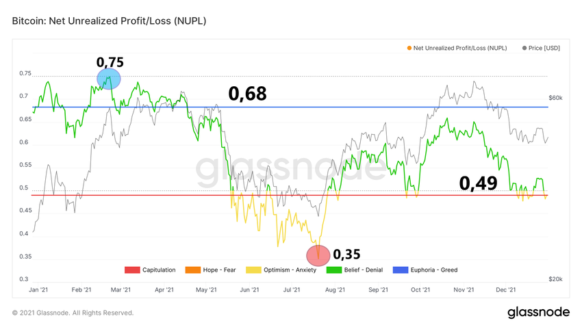SponsoredAl mismo tiempo, el mínimo anual de NUPL fue de 0,35 el 20 de julio (círculo rojo). Esta lectura se mantuvo en el área amarilla de optimismo/ansiedad a pesar de la fuerte corrección en el precio de BTC. Al final del año, el NUPL apuntó al valor límite de 0,49, donde se ubicó por última vez en septiembre. Un retorno potencial a la zona verde por encima de 0,50 sería un indicador de la continuación del mercado alcista y el mantenimiento de la consolidación alcista a largo plazo.