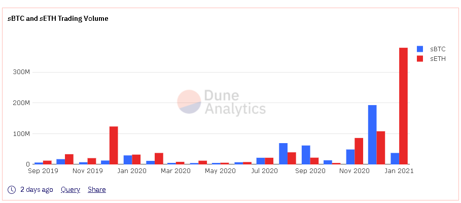 Por parte del volumen de transacciones en los derivados financieros descentralizados de Synthetix, también el 2020 fue referente en crecimiento y hoy se muestran máximos históricos.
