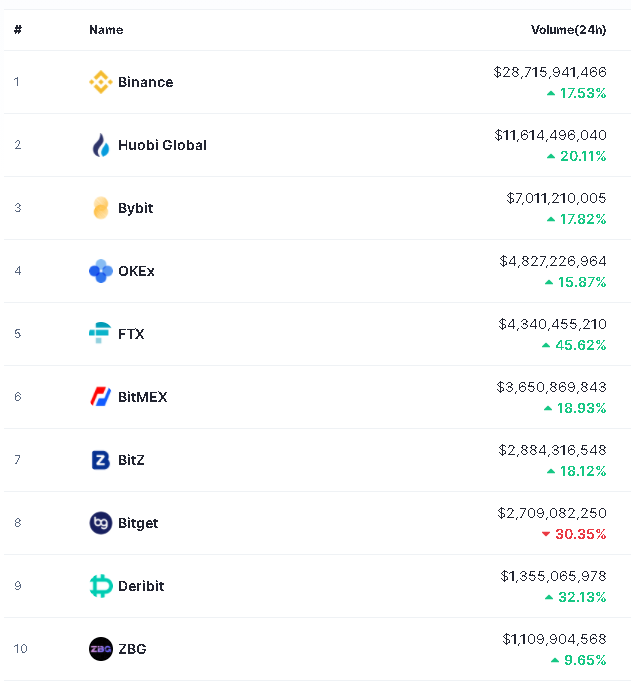 Por ejemplo, para el sector de los derivados financieros, el volumen operado de 24 horas al día de este análisis arroja un promedio de $6,8 mil millones de dólares entre los 10 mayores participantes: Binance, Huobi, Bybit, Bitget, OKEx, BitMEX, FTX, BitZ, Deribit y ZBG, acorde a los datos de CoinMarketCap.