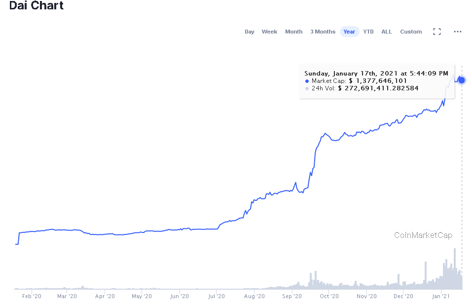 No obstante, el crecimiento número uno en el rubro de las stablecoins lo tuvo DAI, la criptomoneda estable de MakerDAO. Desde $2 millones hasta $1.180 millones de DAI en circulación, la cifra de crecimiento se sitúa en un colosal 58.000%, según CoinMarketCap.