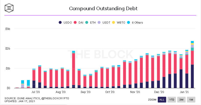 Para el sector de los préstamos descentralizados, los préstamos pendientes de protocolos como Aave y Compound explotaron en el 2020 y a día de hoy se encuentran en máximos históricos, acorde a los datos de The Block.