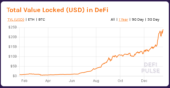 De $687 millones a $23 mil millones de dólares es un crecimiento formidable sin lugar a dudas. Esas fueron las cifras del valor total bloqueado (TVL) en los protocolos DeFi de inicio a final del 2020 de acuerdo al ranking de Defipulse. Significó un crecimiento de 3.247%.
