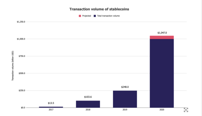 ¿Qué hay del volumen de transacciones? Pues sí, también tuvo un crecimiento sin precedentes. Durante el 2019 las stablecoins transfirieron $248 mil millones. En el 2020 esta cifra se cuadruplicó hasta sobrepasar el billón de dólares en transacciones on-chain. Del total, el 83,5% se movió en Ethereum, mostrando claramente que es la red preferida para estos movimientos, según datos de The Block.