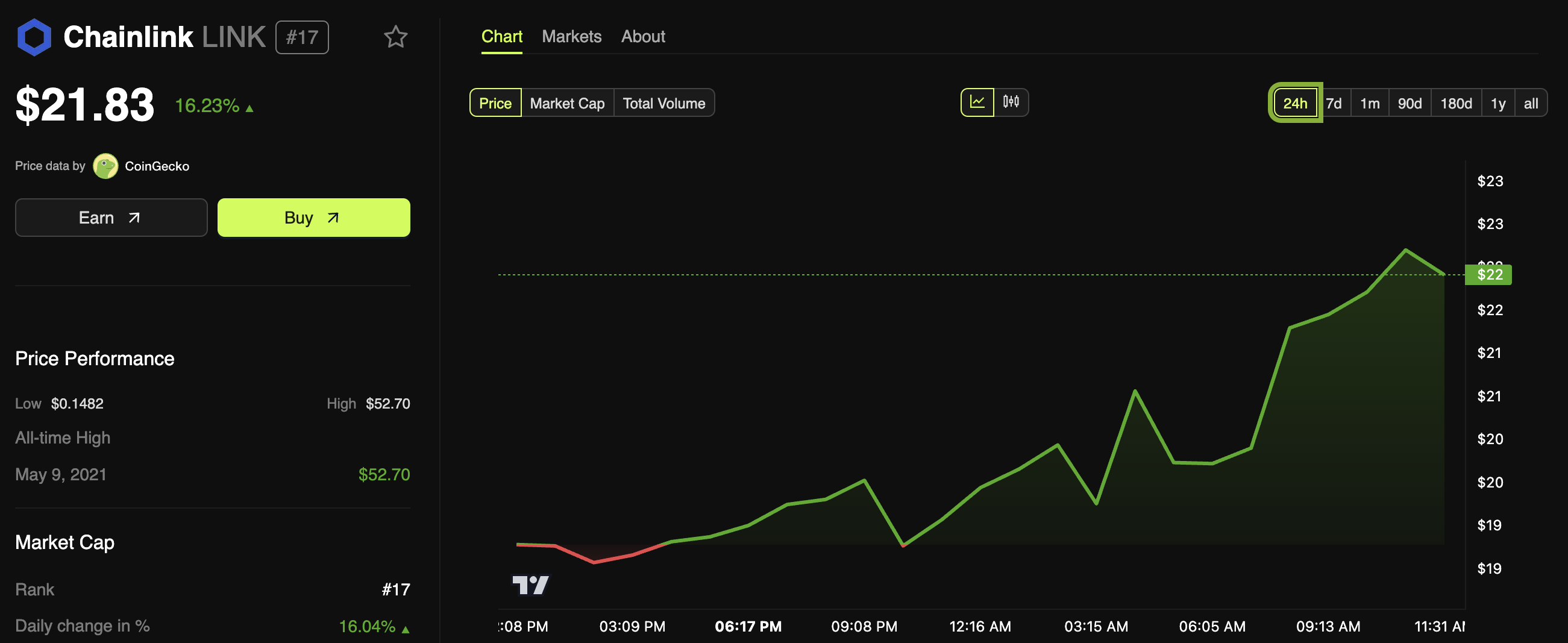 21x también está adoptando el estándar CCIP mientras el token LINK de Chainlink sube constantemente en valor.
