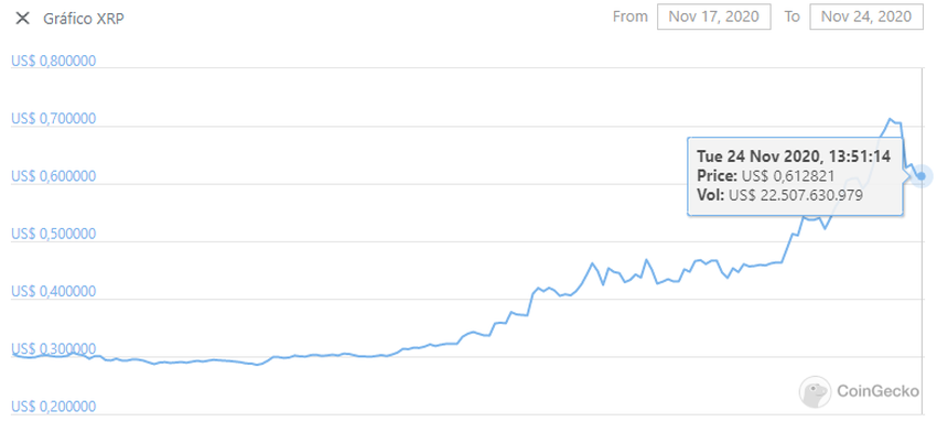 XRP subió un 80% durante el fin de semana y pronto alcanzó el 100% de apreciación. El martes (24), Coingecko ya mostró un crecimiento acumulado de más del 115%. De unos 0,27 dólares, la criptomoneda pasó a más de 0,62 dólares en pocos días. Sin embargo, ya ha habido una retirada sustansiosa en el nivel de 0,71 dólares, alcanzando una subida total de 140% en una semana según CoinMarketCap.