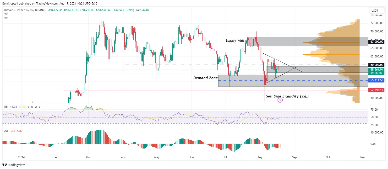 Los perfiles de volumen refuerzan la misma suposición, con picos alcistas y bajistas (naranja y gris, respectivamente) mostrando cautela de ambos lados. De manera similar, la posición del Awesome Oscillator (AO) en territorio negativo con barras de histograma rojas acentúa esta tesis.