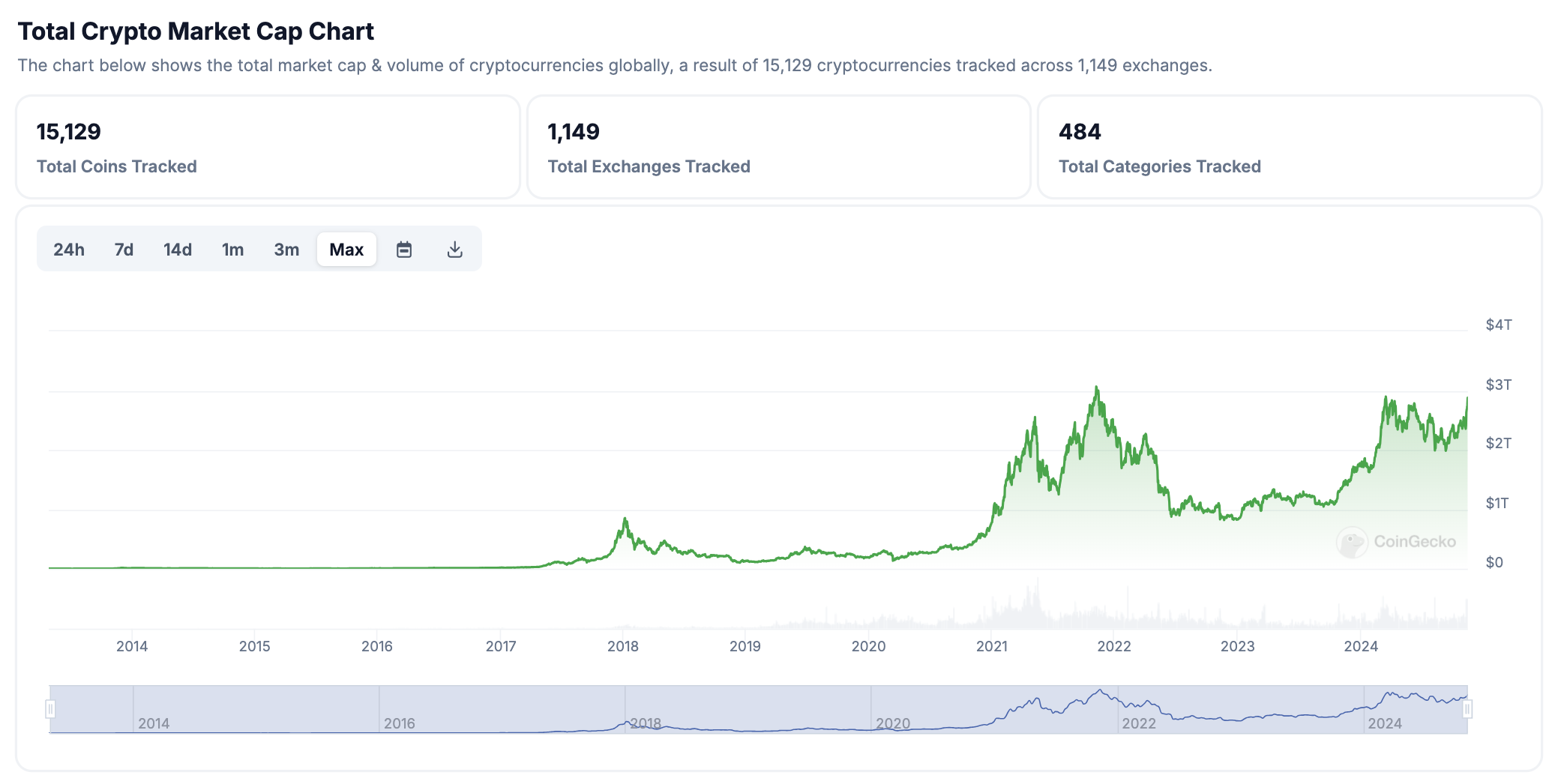 Datos de CoinGecko muestran que la capitalización global del mercado cripto también ha aumentado, alcanzando los 2,9 billones de dólares — niveles vistos por última vez en noviembre de 2021. El volumen total de trading cripto actualmente es de 296 mil millones de dólares, lo que sugiere un creciente interés tanto de participantes minoristas como institucionales.