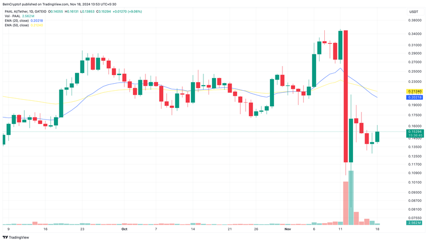 Si bien el precio se recuperó hasta los 0,15 dólares, sigue estando por debajo de las medias móviles exponenciales (EMA) de 20 y 50 días. Dado que el precio de PAAL está por debajo de estos indicadores, aún podría tener dificultades para subir.