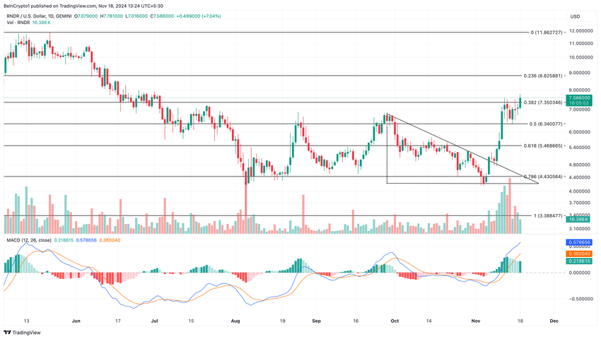 Además, la convergencia y divergencia de la media móvil (MACD) es positiva, lo que indica que el impulso en torno al token es alcista. Si esto se mantiene igual y las ganancias del tercer trimestre de NVIDIA resultan mejores que las del último, RENDER podría subir a 8,83 dólares. En un escenario muy alcista, podría subir hasta los 11,86 dólares.