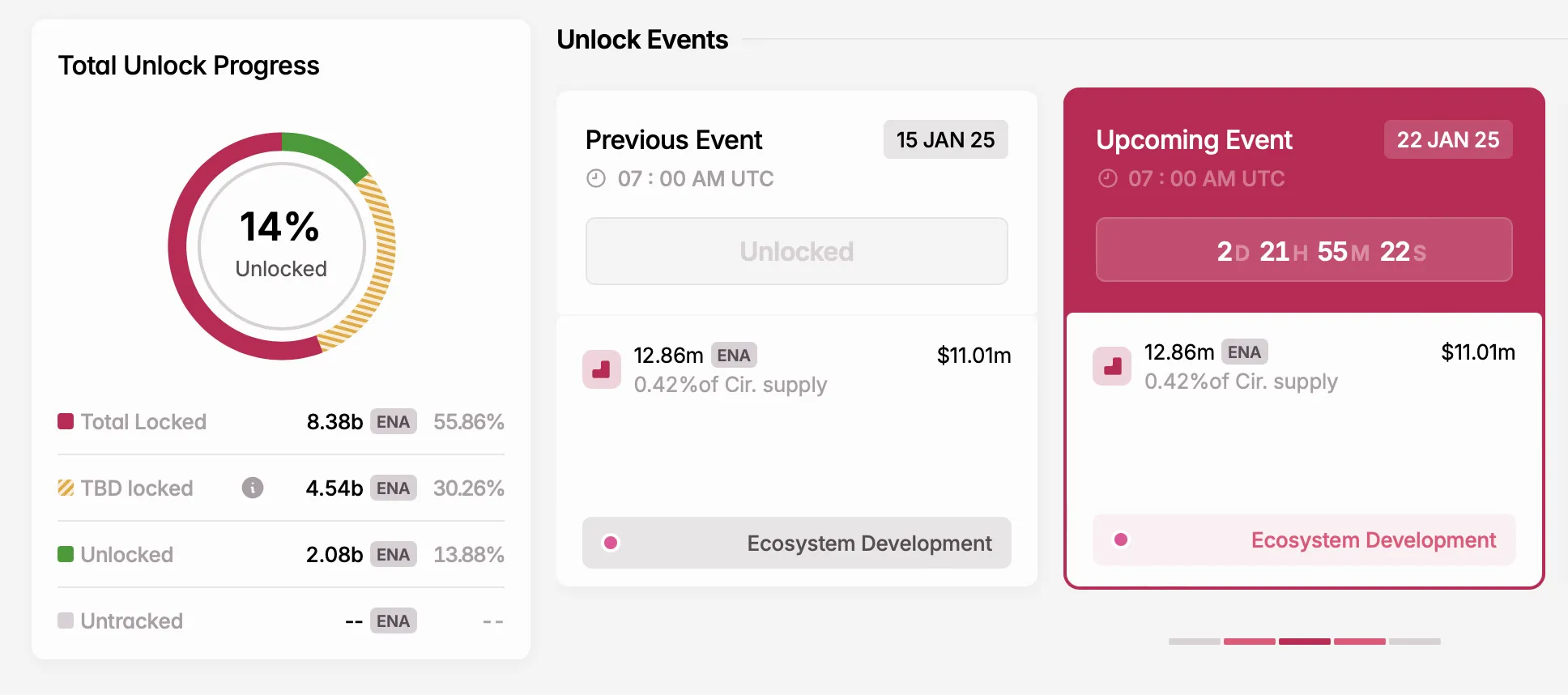 El token nativo de Ethena, ENA, permite a los holders participar en decisiones de gobernanza para el protocolo. El 22 de enero, Ethena desbloqueará más de 12 millones de tokens ENA, valorados en 11 millones de dólares, con los fondos asignados al desarrollo del ecosistema.