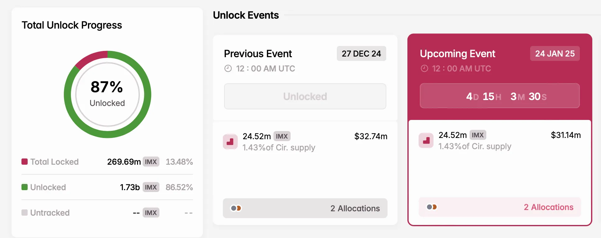 - Número de tokens desbloqueados: 24,52 millones IMX