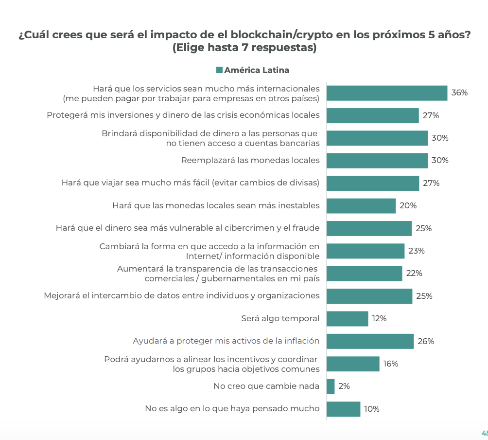 El reporte “Blockchain Latam 2023” expone que los peruanos y los colombianos (42 y 41%, respectivamente) son los que más creen que las criptomonedas facilitarán sus salarios de empresas internacionales. Incluso, 30% de latinos cree que las criptomonedas reemplazarán las necesidades de monedas locales.
