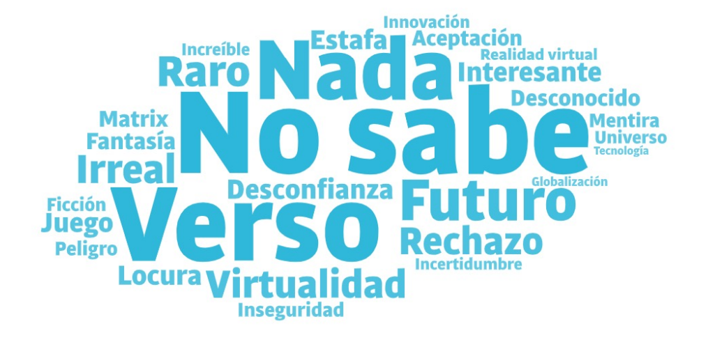 Para las personas que opinaron sobre el metaverso, se les pidió que expresen con una palabra qué les generaba. Las respuestas fueron agrupadas en una nube de palabras y resultó lo siguiente: