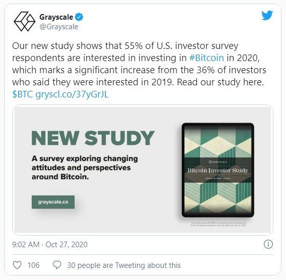 El administrador de activos de activos digitales, Grayscale Investments, publicó su encuesta de 2020 sobre el sentimiento hacia Bitcoin, y los resultados son optimistas. Grayscale, a través de 8 Acre Perspective, encuestó a 1,000 consumidores en los Estados Unidos entre 25 y 64 años.