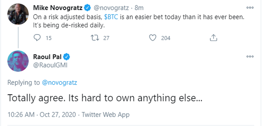También podría deberse a que Bitcoin como clase de activo se está volviendo más maduro. Mike Novogratz, CEO de Galaxy Digital, parece pensar que sí, y dijo en un tweet que Bitcoin sobre una base ajustada al riesgo “es una apuesta más fácil hoy que nunca”, y agregó que “se está reduciendo el riesgo a diario”.