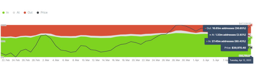 El 13 de abril, la esperanza de recuperación de Bitcoin se topó con un obstáculo cuando la criptomoneda cayó por debajo del nivel de soporte crucial de los 40,000 dólares. Sin embargo, un análisis realizado por InTheBlock encontró que el 60% de los holders de BTC continúan ganando dinero en los niveles de precios actuales.
