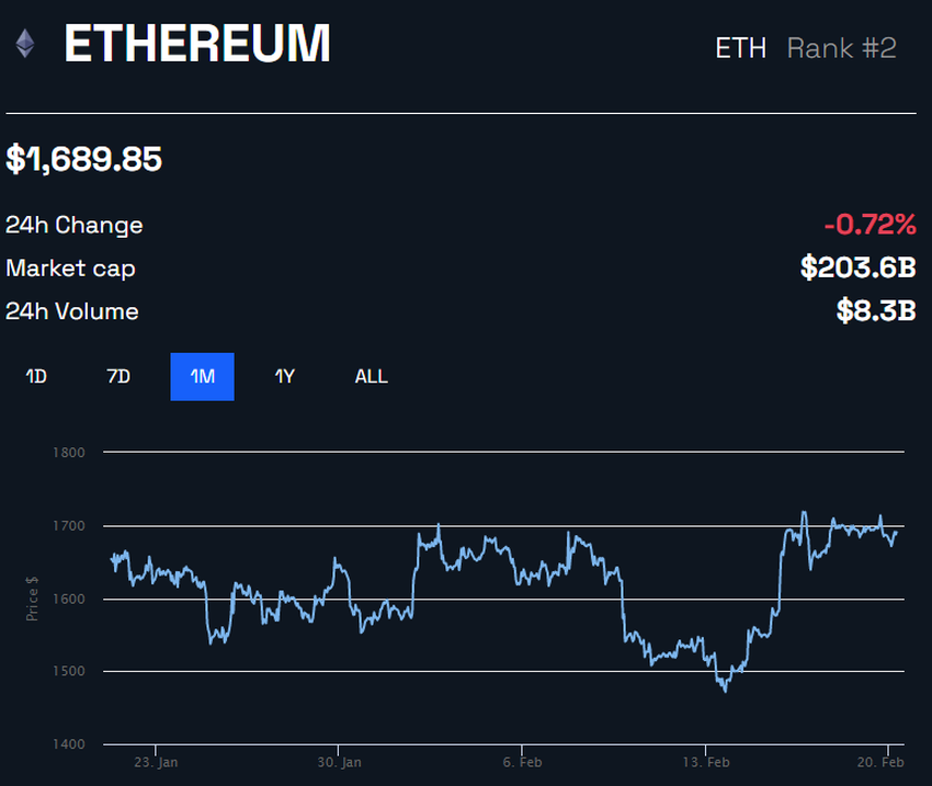 Los precios de Ethereum se han mantenido relativamente estables durante las últimas 24 horas. Como resultado, ETH cotizaba a 1,687 dólares en el momento de escribir este artículo.