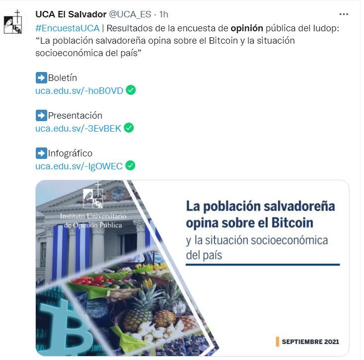 Según la encuesta recién publicada del Instituto Universitario de Opinión Pública de la Universidad Centroamericana, José Simeón Cañas, aproximadamente 7 de cada 10 salvadoreños creen que los diputados de la Asamblea Legislativa deben derogar la Ley Bitcoin. El 96.2% de la población salvadoreña está de acuerdo con que el presidente de la República debe solicitar que se investigue siempre a funcionarios de su Gobierno, cuando estos tengan señalamientos de haber cometido actos de corrupción.