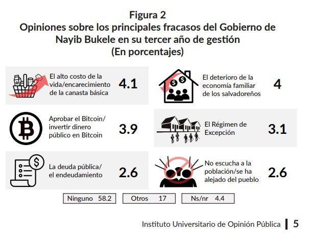 El informe sostiene que la Ley Bitcoin es considerada por los salvadoreños como “uno de los fracasos del gobierno de Nayib Bukele”, ya que consideran que el gobierno “invirtió el dinero público en la compra de Bitcoin”, con 3,9%. Otros puntos que desaprueban al presidente son: alto costo de la vida (4,1%), deuda pública (2,6%), deterioro de la economía familiar (4%), régimen de excepción (3,1%) y que el gobierno “no escucha a la población” (2,6%).