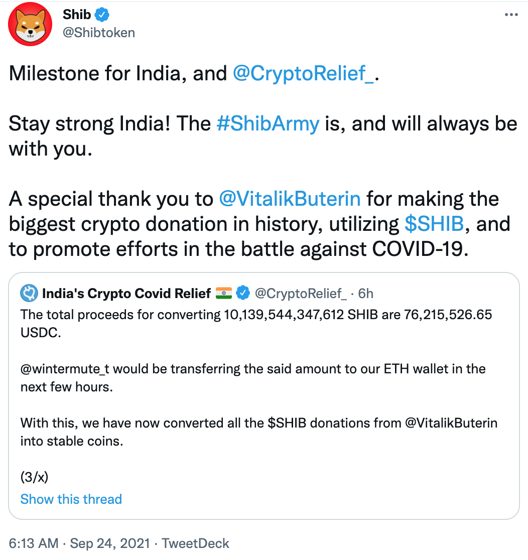 La organización benéfica, India’s Crypto Covid Relief, ha anunciado hoy, 24 de septiembre, que la organización ha completado la conversión total de la donación de Shiba Inu de Vitalik Buterin, culminando en la conversión del valor de 76 millones de dólares de SHIB a la stablecoin USDC.