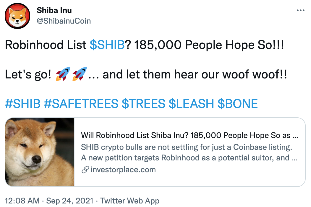 La criptomoneda meme puede que esté cayendo ahora pero anteriormente ha obtenido buenos resultados debido a noticias positivas. La semana pasada Shiba Inu obtuvo un crecimiento de más del 40% debido a la inclusión de SHIB en el listado de Coinbase, actualmente está luchando por ser incluido en el famoso exchange donde se ejerció la rebeldía financiera del caso Gamestop, el exchange estadounidense de Robinhood.