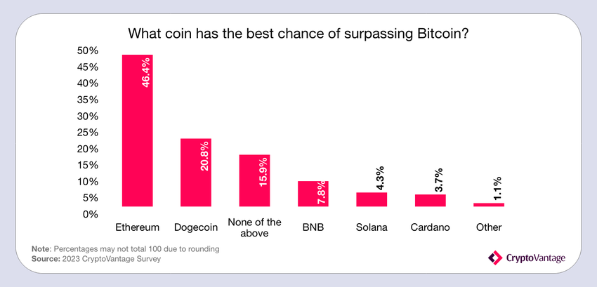 Sin embargo, el 46.4% de los encuestados cree que la segunda criptomoneda más grande, Ethereum (ETH), superará a Bitcoin en términos de capitalización de mercado.