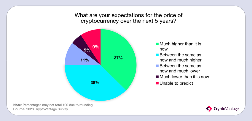 Para el mercado cripto más amplio, el 75% de los participantes cree que los precios de las criptomonedas serán iguales o mucho más altos en los próximos cinco años.