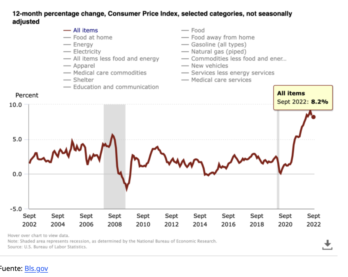 El índice de precios al consumidor (IPC) de octubre de 2022 está programado para publicarse el 10 de noviembre de 2022 a las 8:30 a. m., hora del este. La tasa del IPC de septiembre resultó ser del 8,2 %, solo una caída del 0,1% con respecto a la tasa de agosto del 8,3%.