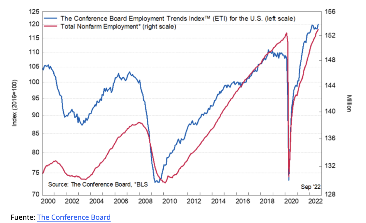 El Índice de Tendencias de Empleo es otro número significativo que muestra hacia dónde se dirigirá probablemente el mercado laboral en los próximos meses. Un número más alto significa que es probable que los puestos de trabajo aumenten pronto. Un número más bajo significa que es probable que los puestos de trabajo disminuyan a corto plazo.