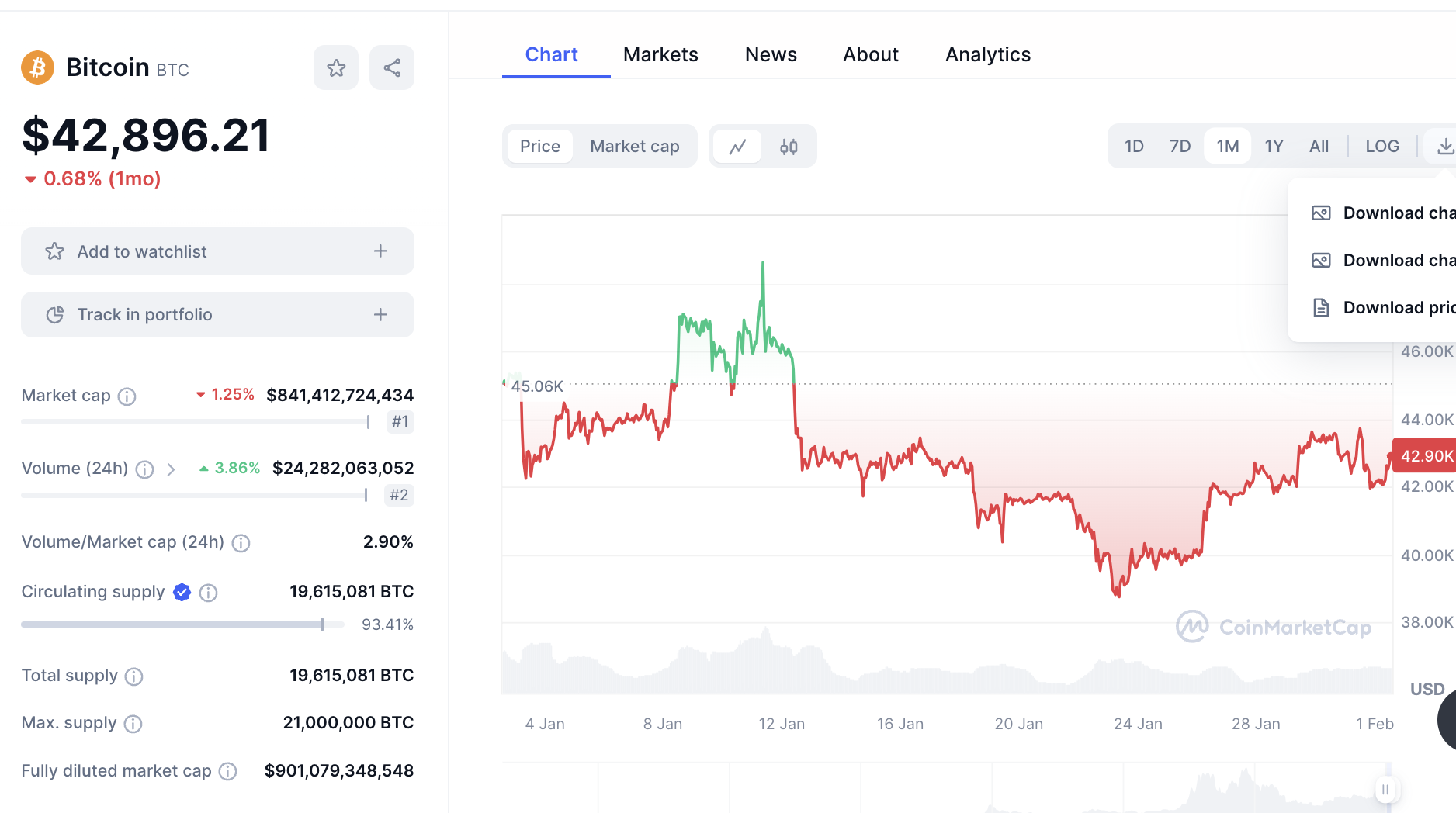 El precio de Bitcoin era de 42,850 dólares al 01 de febrero, pero en el último mes, desde la aprobación de los fondos cotizados en bolsa (ETF) de Bitcoin al contado, el precio de BTC ha pasado de 49,000 hasta los 39,000 dólares, con una corrección de hasta 20%. En tanto, en la última semana, el precio de Bitcoin ha ganado 07,80%, al pasar de 39,84 a 42,085 mil dólares, según CoinMarketCap.