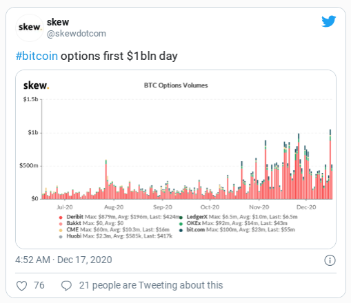 Las cifras de Skew también muestran que el volumen de trading de opciones de Bitcoin alcanzó un nuevo hito, cruzando los 1 mil millones de dólares por primera vez el 16 de diciembre. El gigante de opciones de BTC Deribit representó la mayor parte de este logro, contribuyendo con 879 mil millones de dólares en volumen de operaciones.