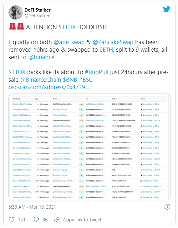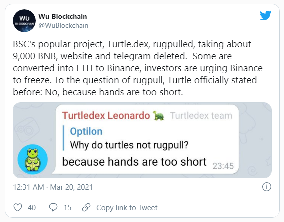 TurtleDex habÃa comentado anteriormente sobre rug pulls (también llamada exit scam), con un tweet que hace referencia a los brazos cortos de las tortugas. El periodista del espacio cripto @WuBlockchain publicó al respecto: