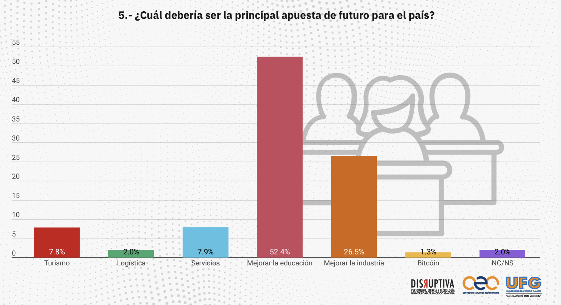 Además, el 52,9% de los salvadoreños cree que la economía del país “sigue igual” tras la adopción de Bitcoin como moneda de curso legal. En la encuesta, solo el 1,3% consideró que Bitcoin “debería ser la principal apuesta” para el futuro de El Salvador, mientras que el 52,4% cree que se debería “mejorar la educación” en un futuro.