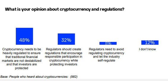 Una gran diferencia es que en Brasil las personas consultadas, poseen una mayor confianza en su sistema financiero. Al punto, que la mayoría cree que las criptomonedas deberían ser altamente reguladas para evitar que afecten los mercados tradicionales.