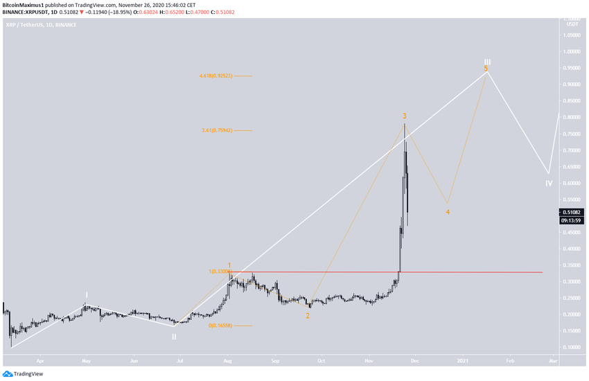 El precio de XRP ha ido aumentando desde que se rompió inicialmente de una cuña descendente a largo plazo en julio de 2020. Sin embargo, el precio se consolidó antes de que la tasa de aumento se intensificara durante la segunda semana de noviembre. Luego alcanzó un máximo de 0,79 dólares el 24 de noviembre.