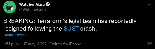 Tras el desplome del ecosistema Terra (LUNA) y su stablecoin algorítmica UST, varios abogados de Terraform Labs habría renunciado a sus cargos.