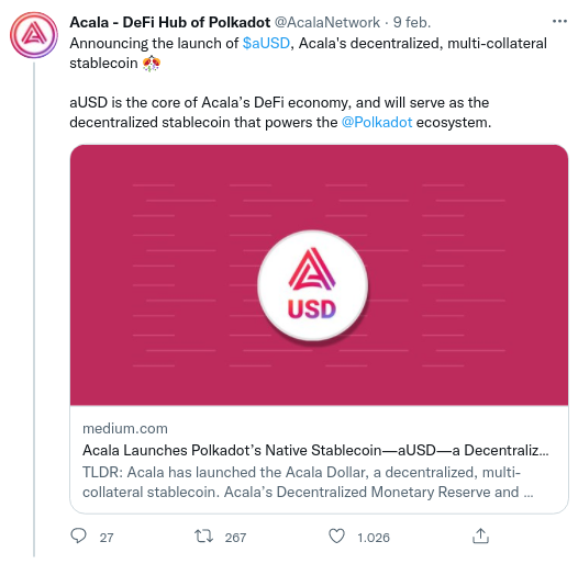Sponsored“Hoy, 9 de febrero de 2022, se lanzó Acala Dollar (aUSD) y está disponible para acuñar utilizando DOT y LCDOT como colateral. La economía aUSD se enciende oficialmente”.