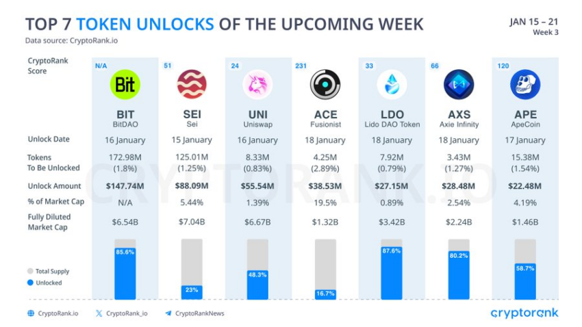 Por otra parte, la plataforma de análisis de criptomonedas CryptoRank señaló que siete proyectos, entre ellos BitDAO, Sei, Uniswap, Fusionist, Lido DAO Token, Axie Infinity y ApeCoin, desbloquearán activos digitales por valor de 407,7 millones de dólares.