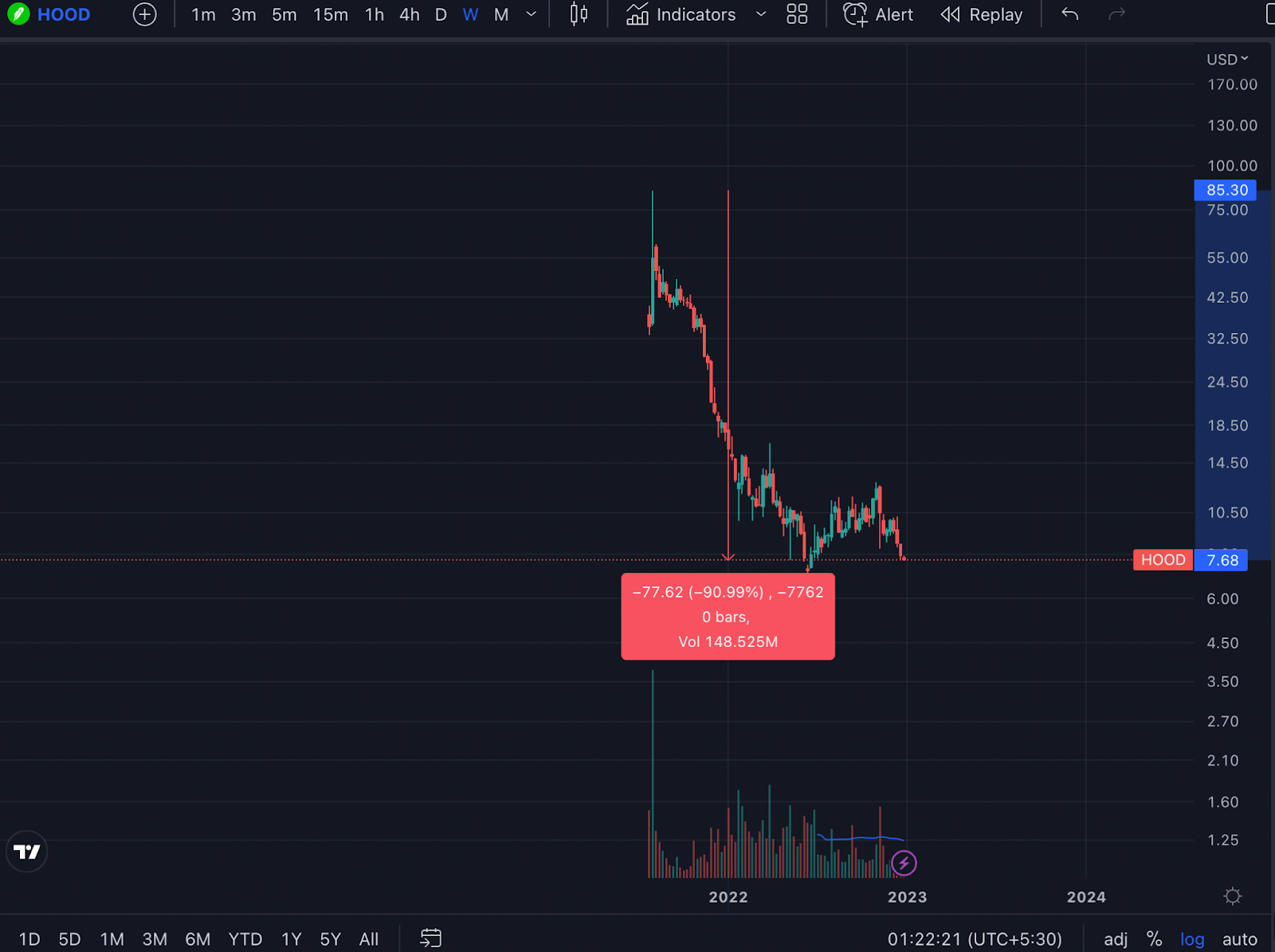 En medio del caos en torno a la propiedad de las acciones de HOOD, el precio se negocia en torno a mínimos mensuales. HOOD cotiza a 7,73 dólares, más del 90% por debajo de su máximo histórico de 85 dólares.