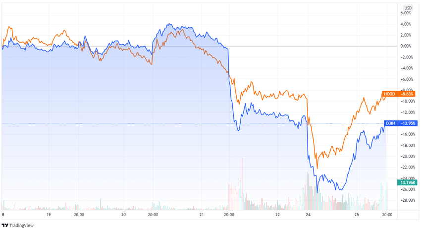 La reciente caída del mercado cripto no ha sido amable con las empresas públicas de criptomonedas. Las acciones de Coinbase cayeron un 13% a 191 dólares el 21 de enero, lo que las coloca muy por debajo de su precio de salida a bolsa de 250 dólares. Robinhood también experimentó una caída del 15% la misma semana, un 60% menos que su precio de salida a bolsa de 35 dólares.